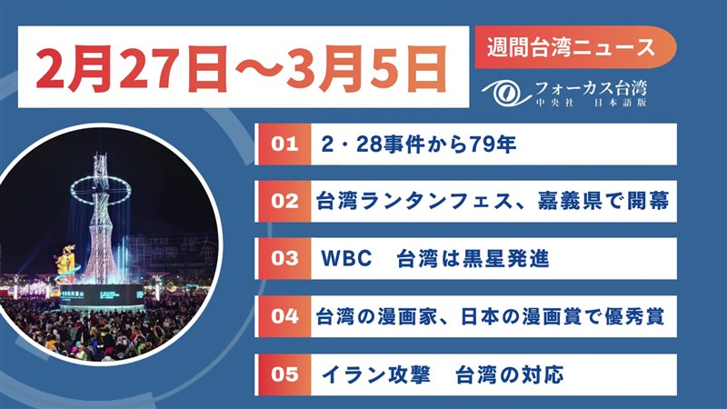中央社フォーカス台湾で今週(2月27日~3月5日)配信した記事の中から、台湾関連の注目ニュースをお届けします。
