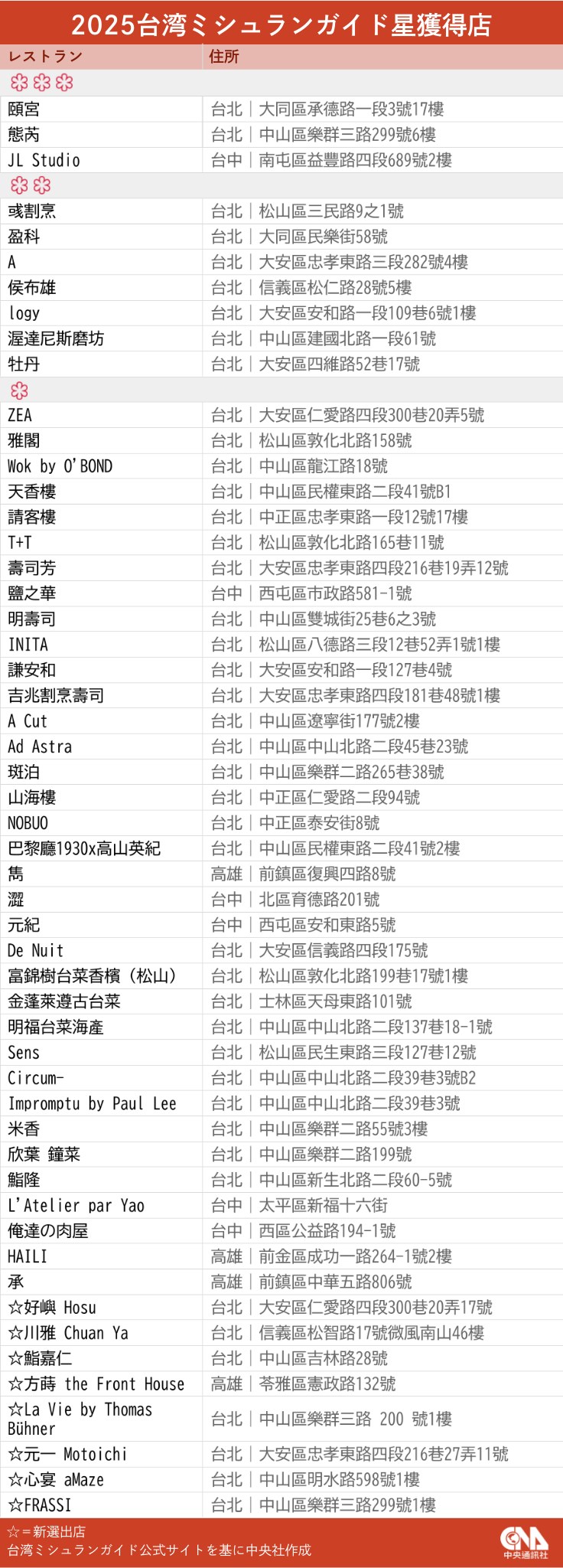 一つ星は43軒で、県市別では台北が34軒、台中が5軒、高雄が4軒。8軒が初選出となった。