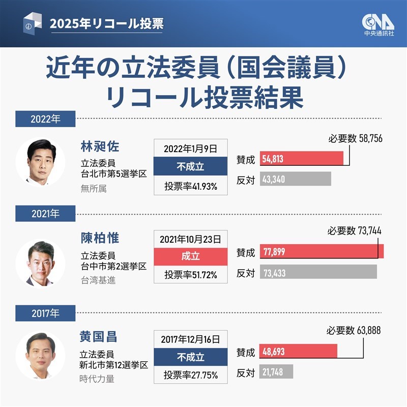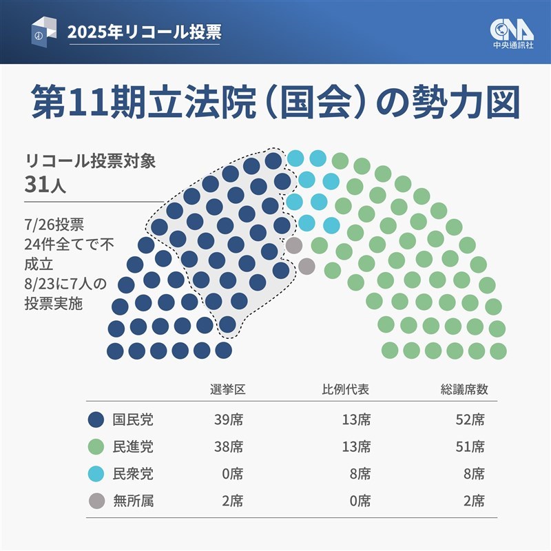 今年に入ってからは、リコール支持の市民団体や国民党が与野党の立法委員のリコール投票を求める署名運動が活発化。最終的に国民党立法委員だけを対象にした投票の実施が決まり、先月26日には第1弾として24人に対する投票が行われたが、いずれも成立要件を満たさず、不成立となっていた。