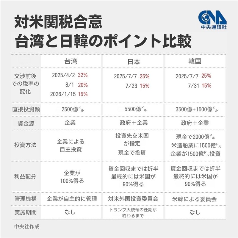 台米は9カ月にわたる貿易交渉の末、先月15日、台湾からの輸入品に米国が適用する相互関税の税率を従来の20%から15%に引き下げる他、通商拡大法232条に基づく関税での最優遇措置、半導体などの分野の台湾企業による2500億米ドル(約40兆円)の対米投資などで合意していた。対等貿易協定締結により、貿易交渉は正式に妥結した。